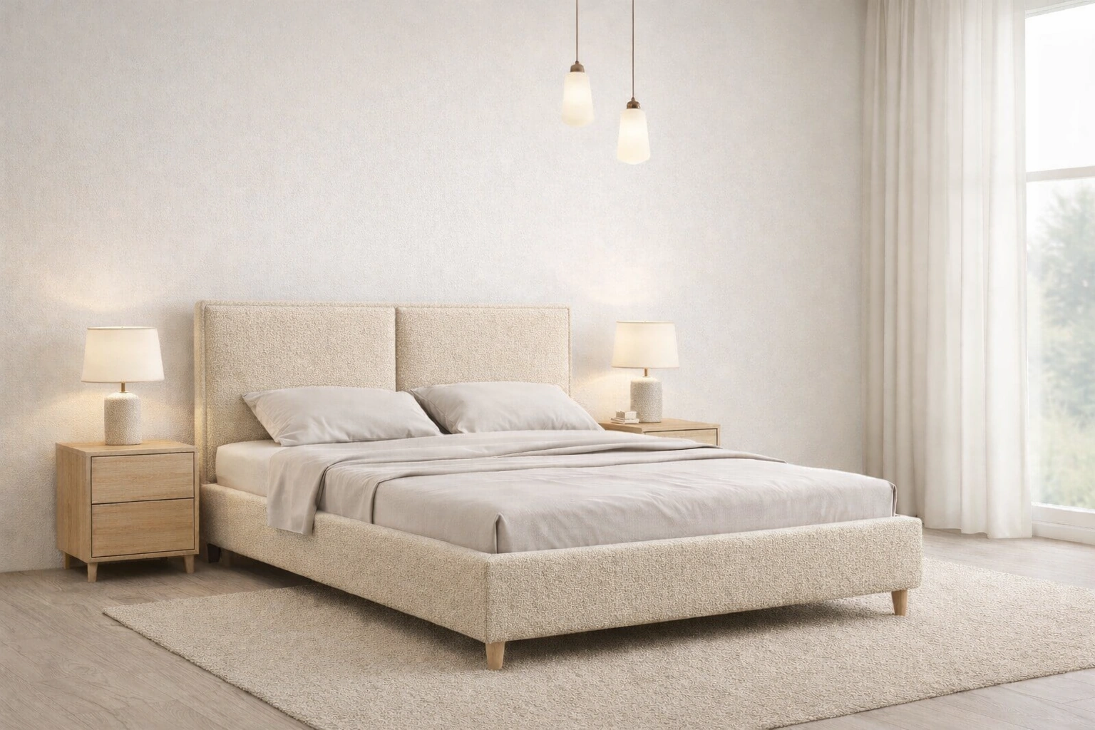 Model Duo - Prosty, minimalistyczny model wezgłowia. Wezgłowie wykonane z grubej owaty tapicerskiej. Dzięki czemu ten model jest wyjątkowo miękki. Idealnie nadaje się do tkanin typu bukla - jak Now or Never marki Davis. Wysokie wezgłowie wykończone gustowną ramką.